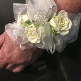 Price: $36.50White Spray Rose Corsage with white ribbon and silver edge and silver wire accent.